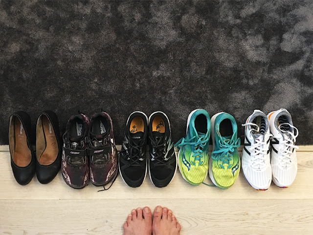 Sko-pakking Lettbent-style. Ok, hadde egentlig bare med tre par løpesko, og et av dem bruker jeg ikke til løping, men så ble det anskaffelse av New Balance 1500 v2 i tillegg. Jeg har slitt ut ett par av disse favorittene, så når de da var å finne til halv pris på messen… Ikke noe å lure på.